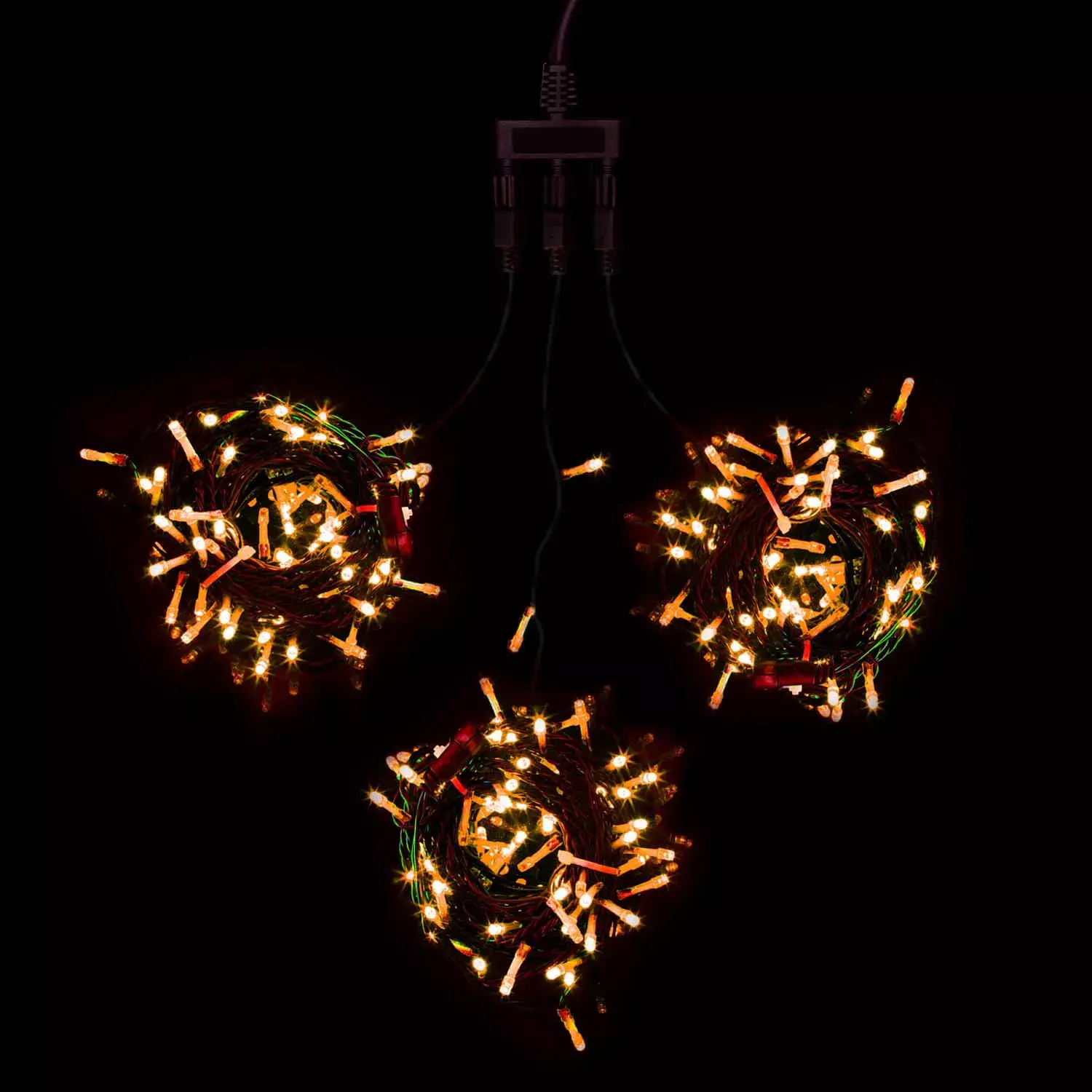 Комплект гирлянд для деревьев LTC состоит из 3 нитей длиной 20 метров, разветвителя 3 лучевого, трансформатора 60W на 24V. Степень защиты данного комплекта IP44, что позволяет использовать данный комплект при температуре до -30оС. Для удобства монтажа, комплекта, при отрицательных температурах рекомендуется разогреть комплект в помещении. Комплект готов к использованию, дополнительные аксессуары для работы не требуются.