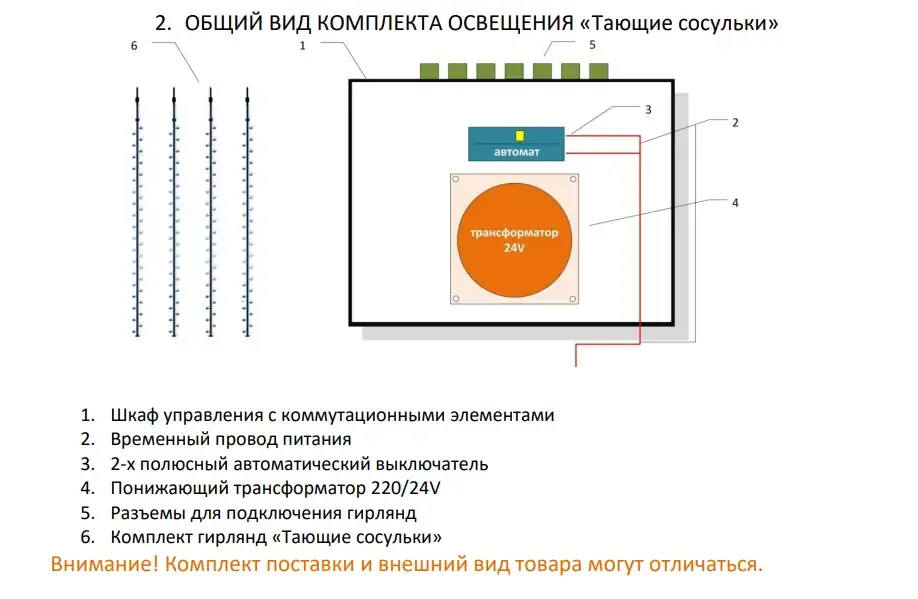 Многофункциональный комплект освещения «Тающие сосульки» представляет собой устройство для придания особого эффекта новогодним елкам, а также различным декоративным изделиям, используемых при оформлении витрин, праздничном оформлении деревьев, кустарников, зданий. Гирлянда подходит для всех типов елей от 3 до 30 метров высотой. Благодаря плавным переливам света, включенная гирлянда создает эффект тающих сосулек.