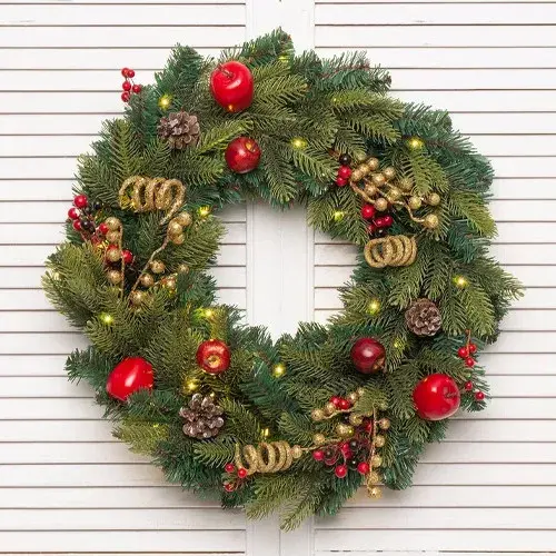 Новый год – самый нарядный и волшебный праздник! Предлагаем Вашему вниманию Хвойный Венок «Богемия». Для украшения дома во всем мире используют эффектные хвойные венки. Его можно повесить на дверь, или на стену. Венок поставляется в комплекте с электрогирляндой из 30 ламп теплого белого цвета и очень красивым декором из натуральных шишек и искусственных ягод и фруктов. Гирлянда работает от батареек, благодаря чему венок можно повесить в любом месте, вне зависимости от наличия электросети. Множество особенностей изделия превращают его в отличный подарок Вашему дому.